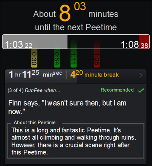 This is what you’re here for: to find out the best time you can run and pee during a movie. These are called Peetimes.